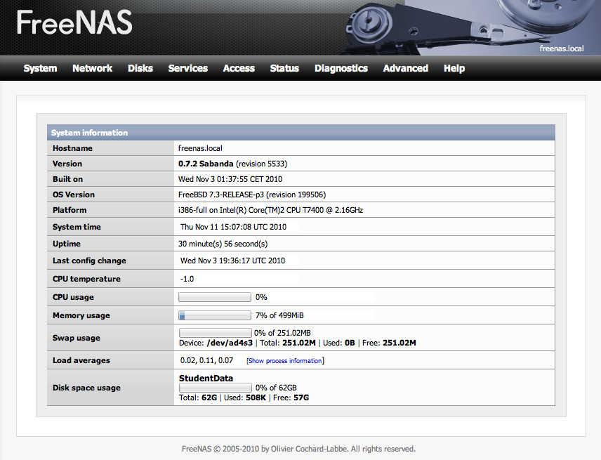 This is the third in a series about FreeNAS, the free network attached storage application which allows you to create an inexpensive but highly capable network file server for backups, iTunes, and general file sharing. Our application is a server for student data. We want to give each student a secure folder in which to store files that they create and use when working in our student computer labs. The two previous postings are: